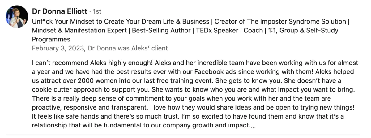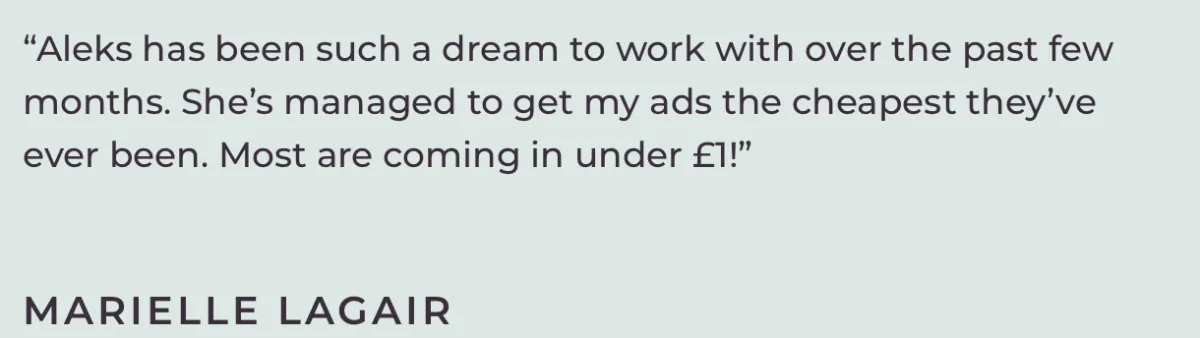 Our founder, Aleks Certa, has been doing paid media for 7+ years. She's worked with ad spends of $5k to $150k a month bringing in 4-8x return on ad spend for high ticket coaches and consultants.